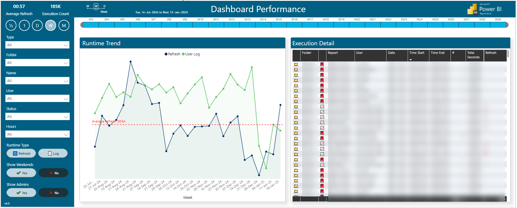 A Power BI template with a trend and detail execution log, bookmarks for half hour, hour, day, week and month to change the date timeline selection and the X axis date hierarchy level on the trend. The log contains information on the length of time spent running a report's dataset query and the time spent processing the data. If you're a report server administrator, you can review the log information and identify long running tasks. You can also make suggestions to the report authors on the areas of the dataset or processing report they might be able to improve. |